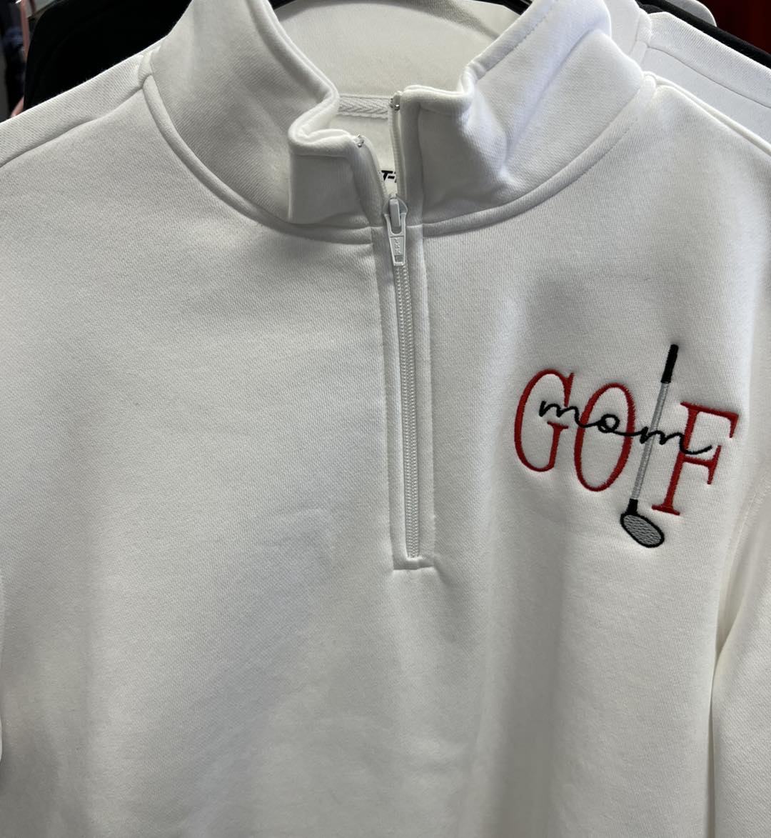 Say it loud! You're a golf mom! Embroidered on a Sport-Tek qtr zip. White is shown in the photo. Also, available in red or athletic heather. Other colors available on request.
