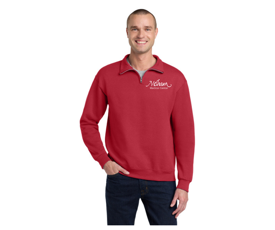 Popular Jerzees 1/4 zip in a unisex fit, embroidered, available in maroon, black, and red.