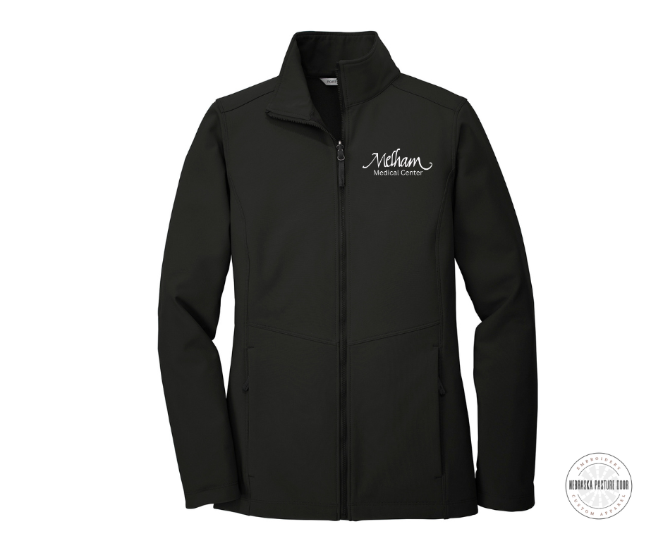 Softshell jacket embroidered jacket. Colors Black, graphite, and navy will embroidered with white thread. Gusty grey will be embroidered navy thread. Available in black, gusty grey (light grey), Graphite (dark grey), or River Blue Navy.