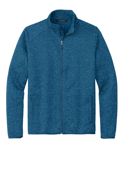 Men's or unisex fit sweater fleece jacket with full zip and left chest Melham logo embroidered in black or silver to match the jacket color. Available in black heather, river blue navy heather, gray heather, or medium blue heather.